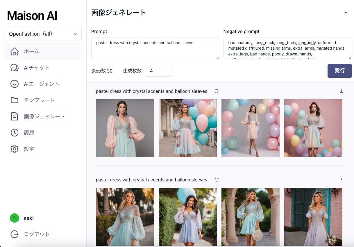 今年8月にβ版の提供が開始となったサービス「Maison AI(メゾンエーアイ)」は、ファッション業界に特化した文章・画像生成AIツールです。AIにファッションデザイナーやパタンナー、そして人事や法務など特定の職種を設定する「AIエージェント機能」などを搭載しているほか、今月にはテキストから画像を生成する「画像ジェネレート」も新たに機能として追加され、既に多くの方からご好評の声をいただいています。