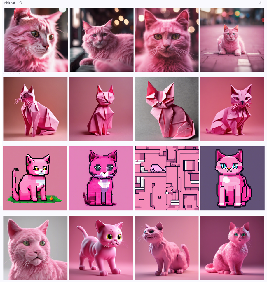 An example of specifying a photo, origami, pixel art, 3D model, and image style from above and generating it with the prompt "pink cat"
