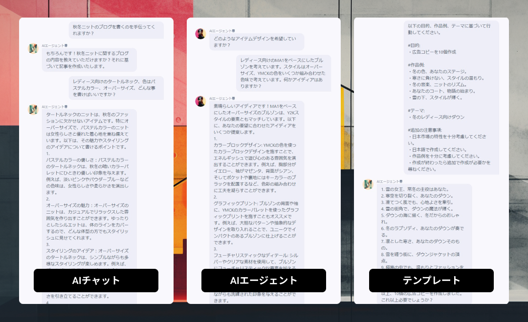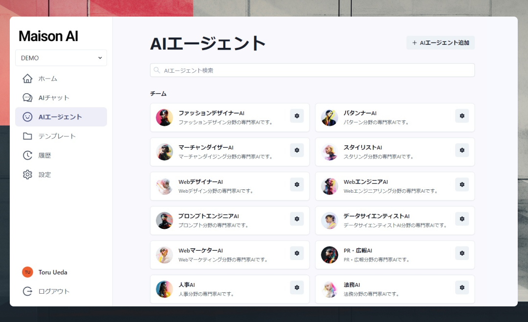 올해 8월에 β판의 제공이 개시된 「MaisonAI」는, 패션 업계에 특화한 문장·화상 생성 AI 툴입니다. MaisonIAI의 메인 기능 중 하나인 'AI 에이전트 기능'은 AI에 패션 디자이너나 패턴나, 그리고 인사나 법무 등 특정 직종을 설정함으로써 전제 지식이 필요한 질문에서도 보다 정밀한 답변을 얻는다. 일이 가능해지고, 많은 분들로부터 호평의 소리를 받고 있습니다.