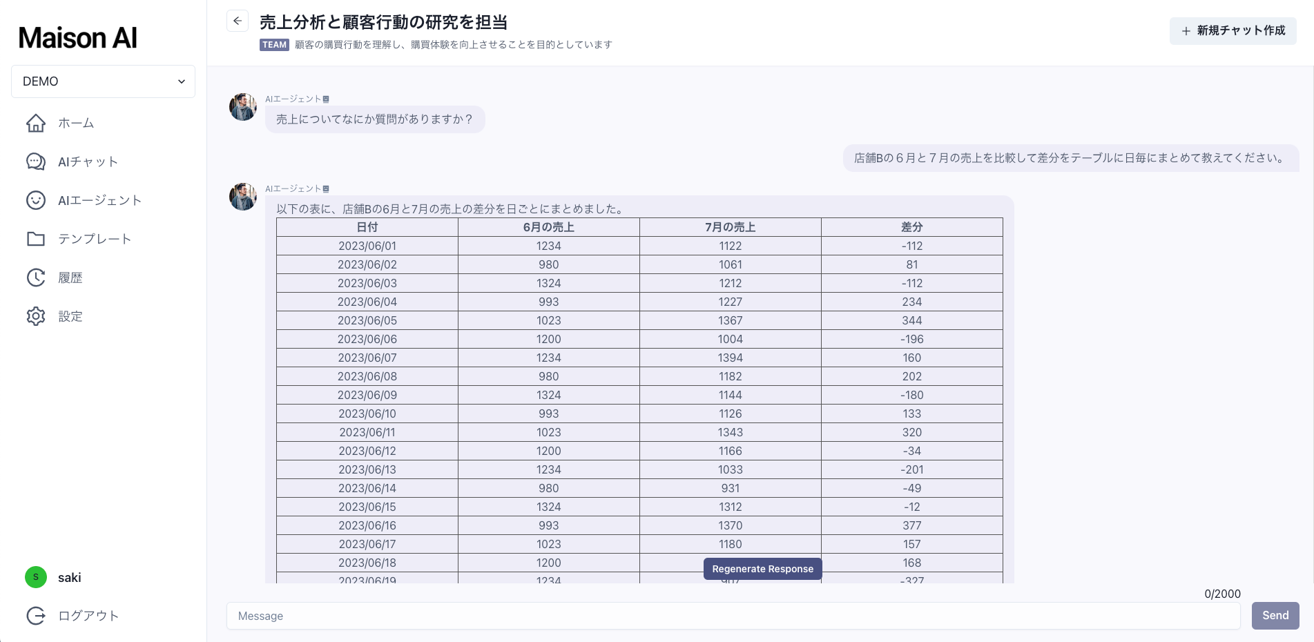 매출 등의 정보가 기재된 엑셀이나 csv 파일을 MaisonAI에 업로드하는 것만으로 자동으로 파일의 정보를 AI 에이전트가 읽고 분석 결과를 생성하는 것도 가능합니다(이미지 참조). 단순 작업도 AI에 의뢰하는 것으로 인적 실수를 억제할 수 있어 인간은 보다 크리에이티브한 대처에만 집중할 수 있습니다.