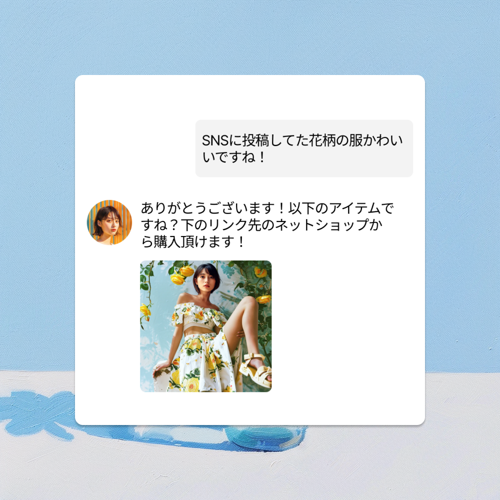 AIスタッフがアパレルアイテムを着用した画像で紹介したり、チャットで会話しながらアイテムを紹介するサービスです。